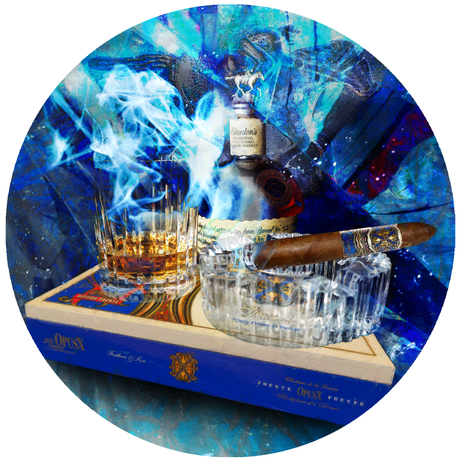 There are objects in this world that transcend their material form—objects that evolve into symbols of discipline, patience, and mastery. The Arturo Fuente Opus X is one of those rare creations. Widely regarded as one of the most coveted cigars ever produced, the Opus X line represents the pinnacle of cigar craftsmanship, born from decades of relentless pursuit and innovation . This artwork capturing the 20-Year Arturo Fuente Opus X is not merely a visual interpretation—it is a translation of legacy into form, of ritual into permanence. The cigar smoke rises to form the Blanton’s Horse in the abstract background.