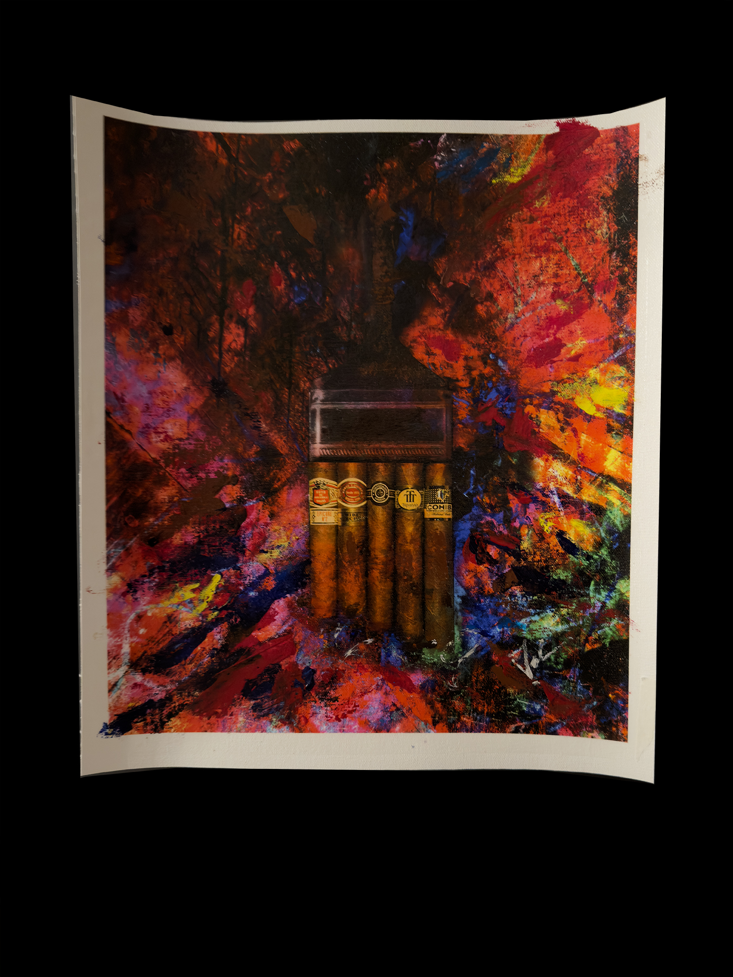 Valentine’s Art of Cuban Cigars is not merely a painting; it is an original mixed‑media celebration of culture, craftsmanship, and the heritage of Cuban tobacco. Framed by a nuanced application of acrylics and enriched through his signature overpainting process, the work conjures smoky honeyed amber undertones, reminiscent of the rich hues found in a high‑proof bourbon glass resting beside a freshly lit Cohiba or Montecristo Cuban cigar. These visual elements evoke both comfort and contemplation, inviting the viewer to linger as though savoring the final slow draw on a vintage cigar.
