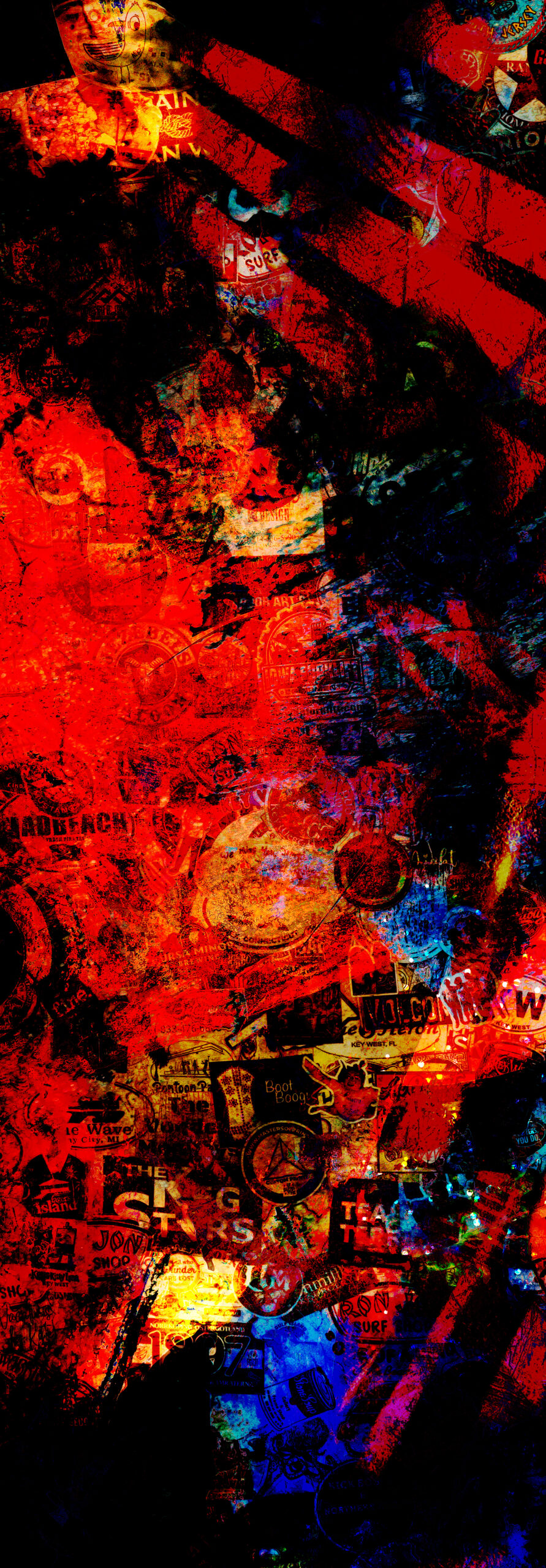 From the Series: Chromatic Insurrection – inspired by a trip to Key West Florida where visitors place decals and stickers on walls in a rowdy form of art.
