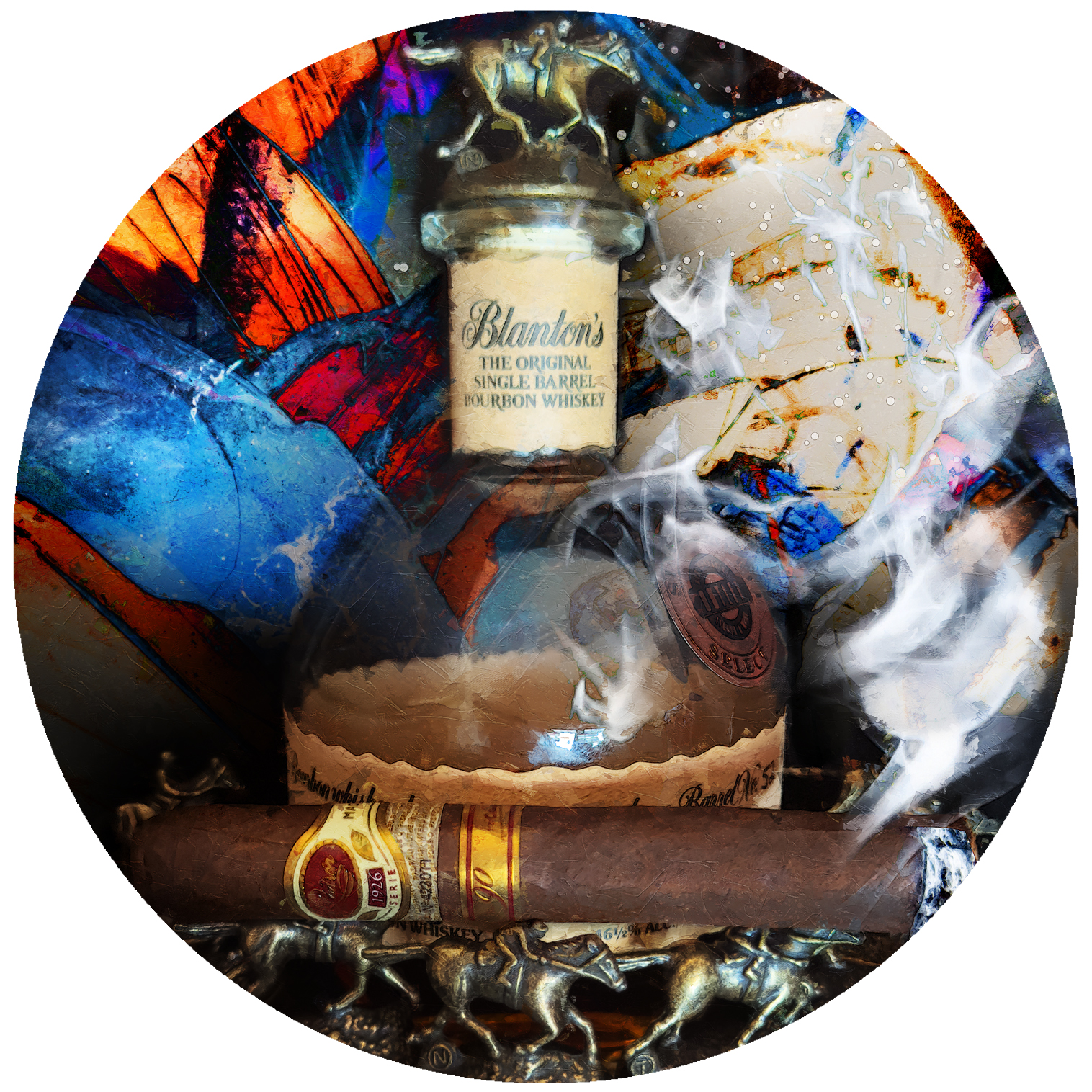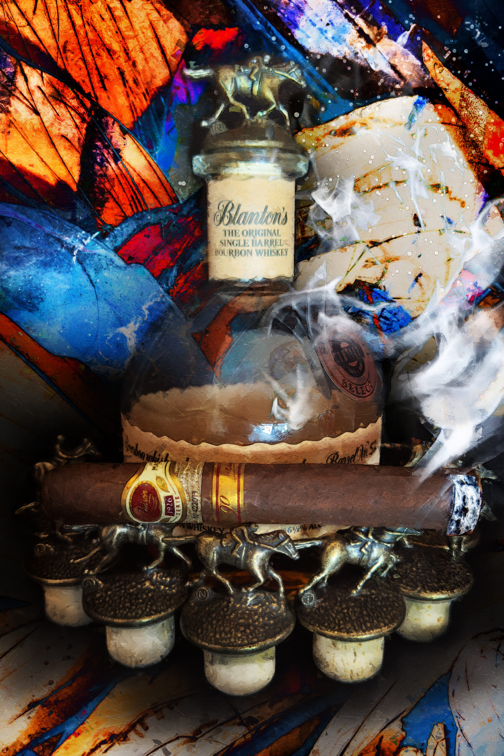 In Padron 90th with All the Blanton’s Horses: After the Light Fades, this work does not simply depict objects—it captures the quiet ceremony that surrounds them. Like the final draw of a cigar or the last amber reflection in a glass of bourbon, this piece exists in that rare, suspended moment where intensity gives way to introspection.