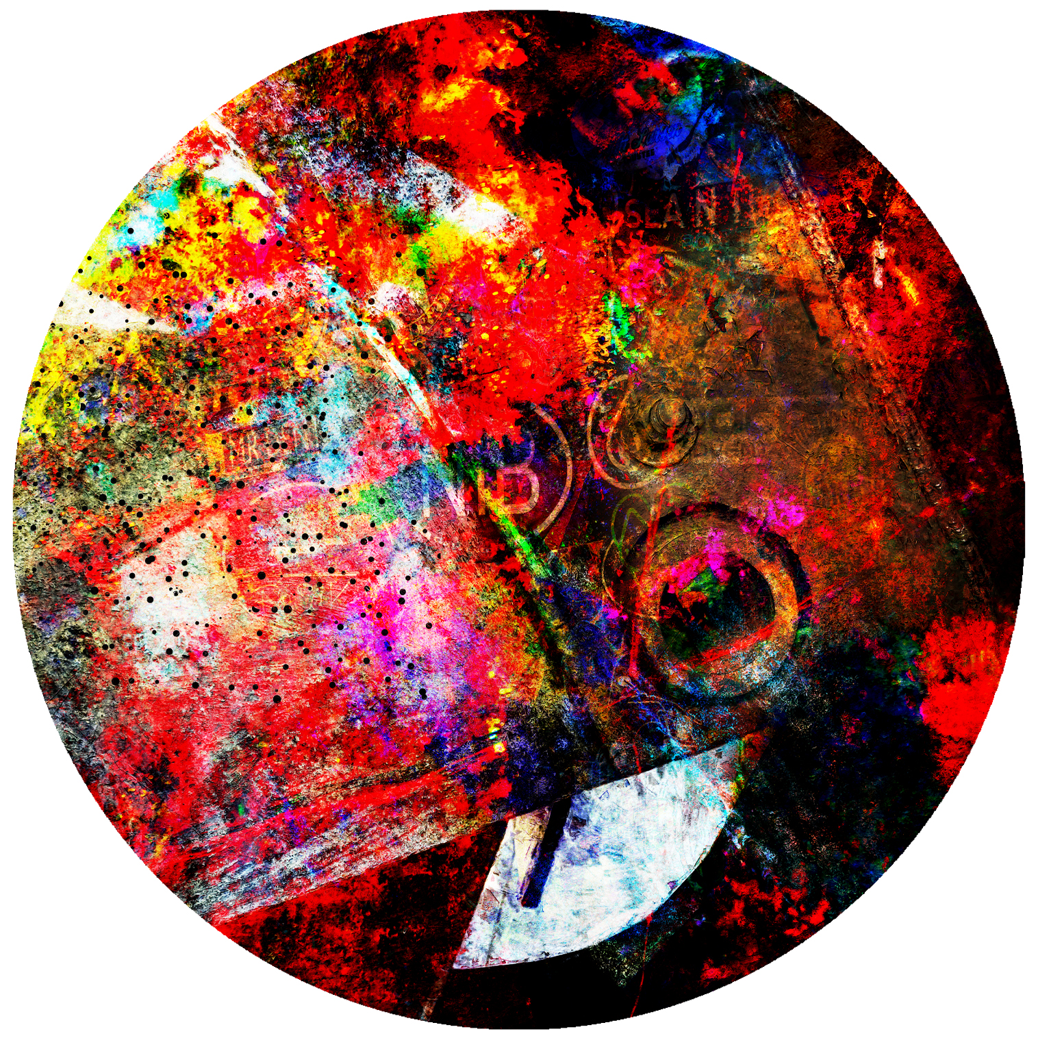 What elevates “Riot Architecture” beyond pure abstraction is its textural complexity. The surface reads like a palimpsest—histories written, buried, and rewritten again. There are moments where fragments of visual language emerge: hints of typography, mechanical gestures, and ghosted imagery that seem to surface briefly before being overtaken. This is where the overpainting process becomes essential. Rather than treating each layer as a final statement, it’s used as a negotiation. Marks are laid down, resisted, obscured, and reasserted. The result is a surface that feels lived-in—worked, challenged, and resolved through tension rather than decoration.