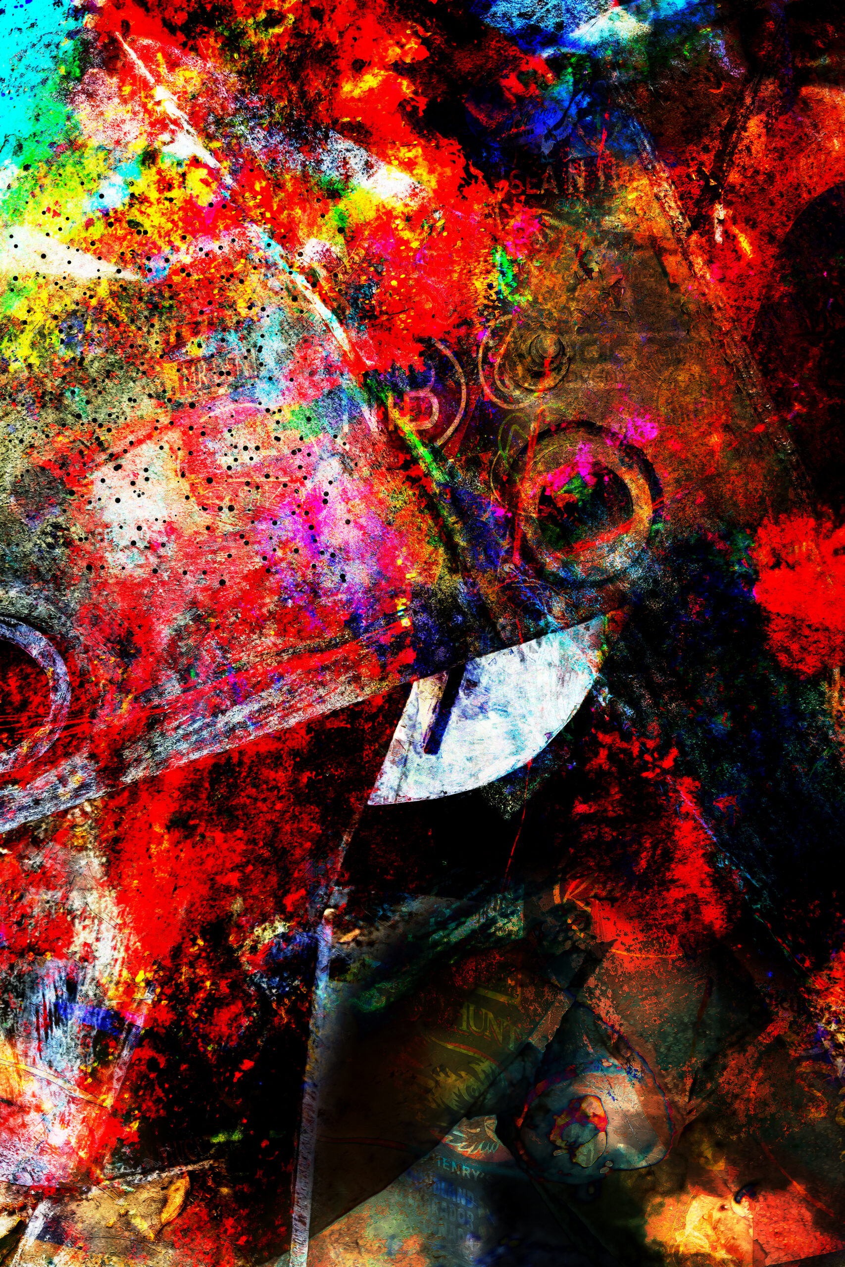 “Riot Architecture” stands as a controlled eruption—an intentional collision of structure and breakdown, where the language of abstraction becomes both the medium and the message. At first encounter, the work feels almost confrontational: a field dominated by searing reds, fractured by black voids and punctuated with bursts of electric color. But beneath that immediate intensity lies something far more disciplined—an engineered chaos that reveals itself slowly, layer by layer.