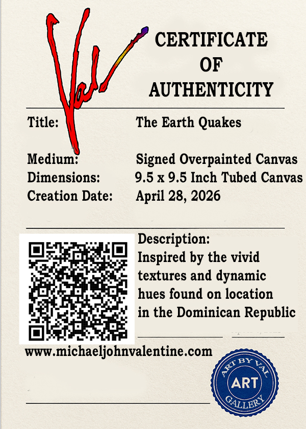 A signature work in Michael John Valentine’s acclaimed Earth Series, The Earth Quakes is a masterfully executed mixed‑media artwork that evokes the primal beauty and kinetic energy of our planet’s inner forces. Inspired by the vivid textures and elemental hues witnessed on location in the Dominican Republic, this piece captures the rhythmic resonance of earth’s movements through layered acrylics, dynamic composition, and rich, organic color ways.