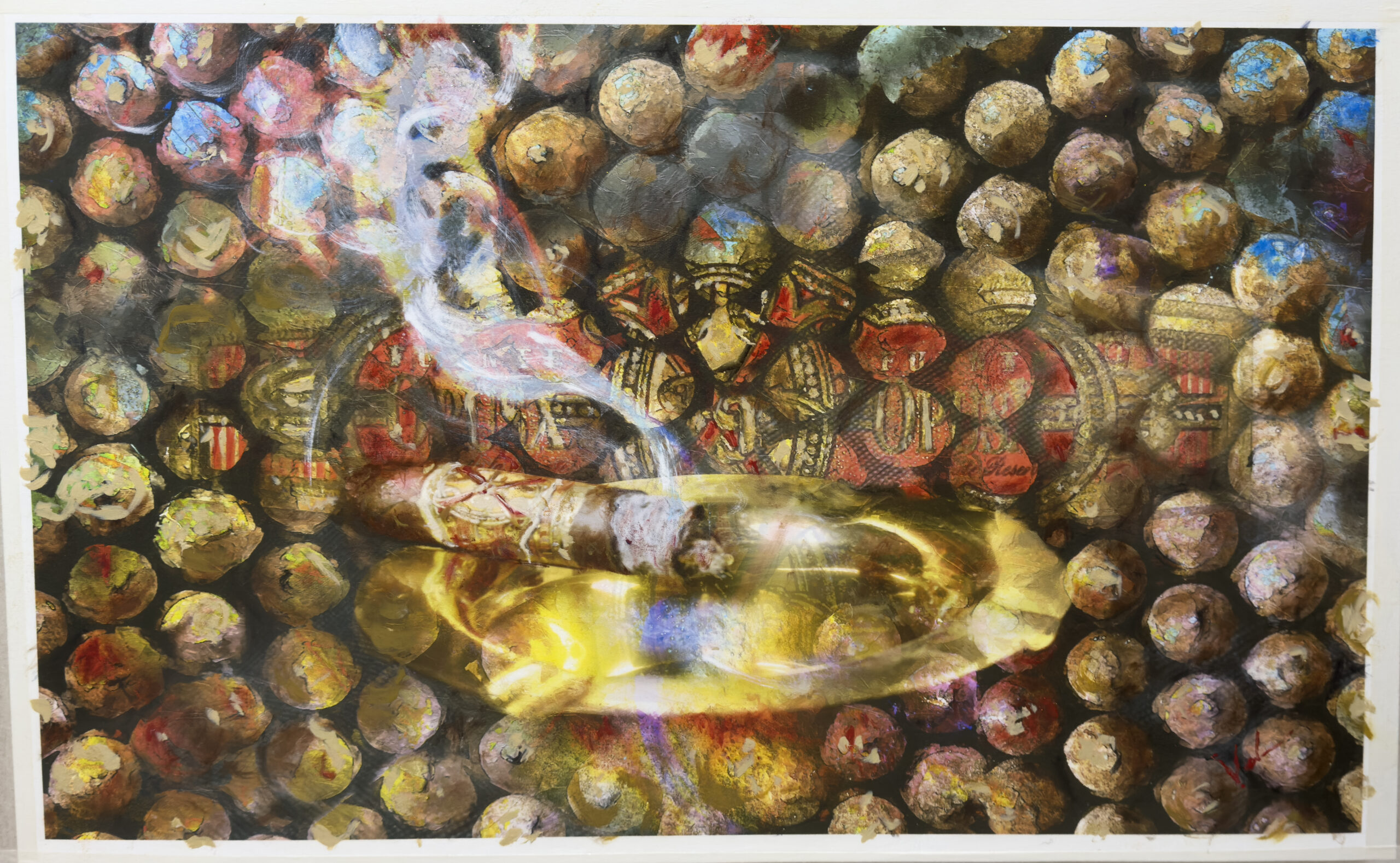 Michael John Valentine masterfully renders the iconic cigar, with the tips of each cigar subtly blending into the background, creating an interplay between tangible form and atmospheric abstraction. This effect evokes the lingering aroma and slow burn of a fine smoke, drawing the viewer into a sensory experience that is both visual and almost tactile.