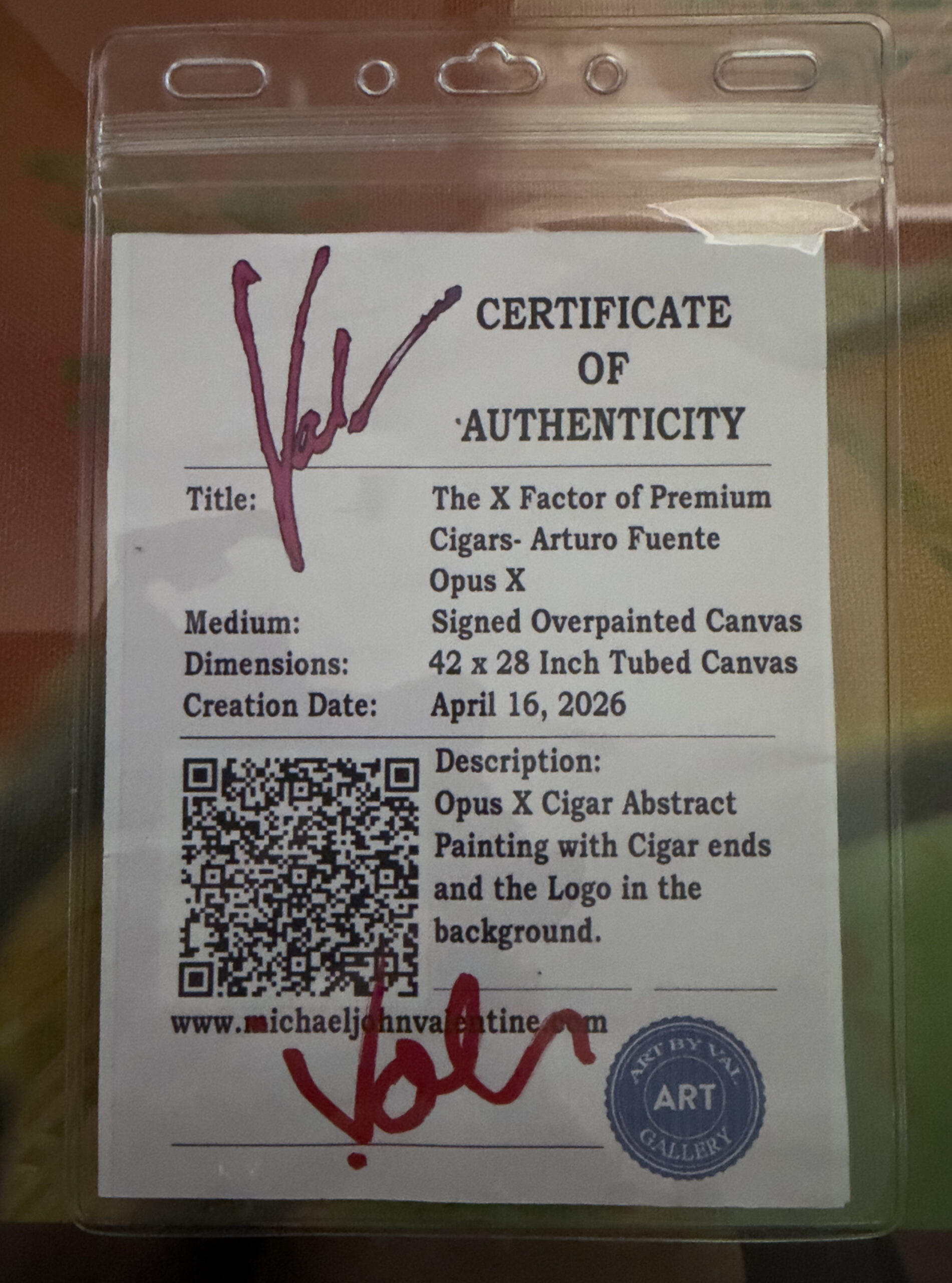 Opus X art, sensory cigar painting, premium cigar wall art, luxury masculine décor, cigar collector artwork, limited edition cigar canvas, Michael John Valentine, high-end cigar art, Dominican cigar masterpiece, ember and smoke art.