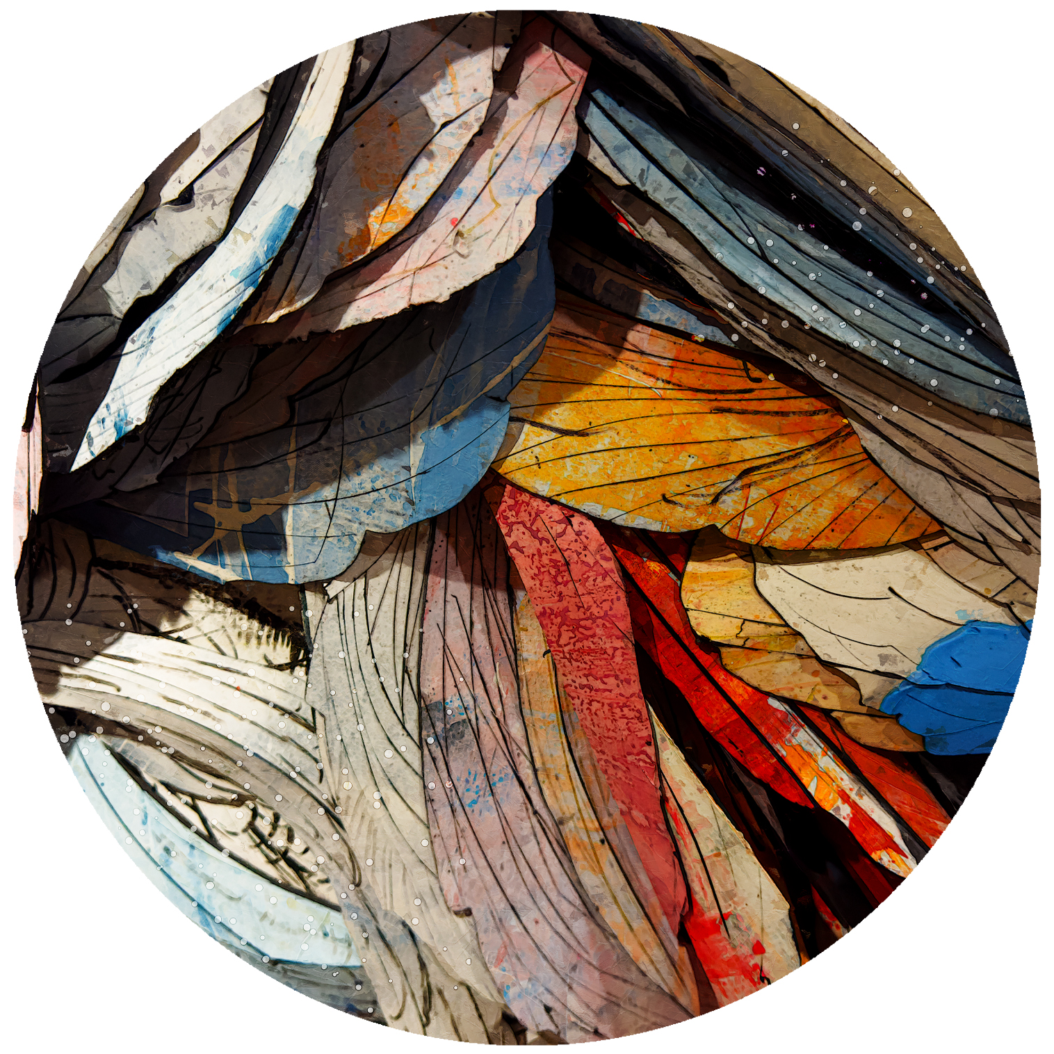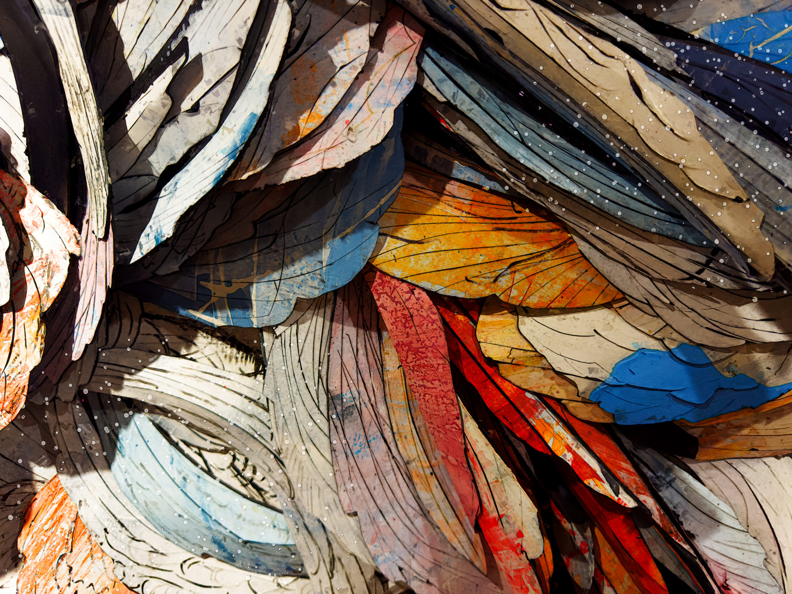 The painting carries an immediate sense of motion, yet paradoxically it also feels restrained — almost quiet. That contradiction became central to the work’s identity during the creative process. Sweeping ivory structures collide against deep blacks, fractured metallic tones, ash grays, and bursts of ember-like color that appear to emerge from beneath the surface itself. Certain passages feel aerodynamic, while others resemble geological compression or fragmented wings suspended mid-flight. The painting never fully settles into one interpretation, and that ambiguity is intentional.